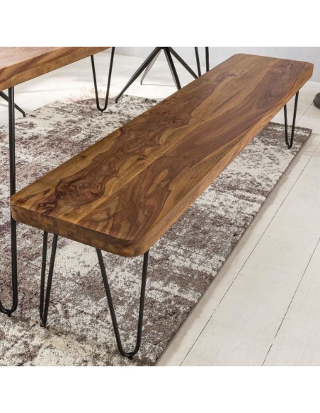 Bænk fremstillet i et design af sortlakeret metal og brun sheeshamtræ. Bænken måler 46 cm i højden og 160 x 40 cm i bredde og dybde.