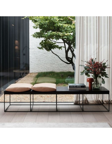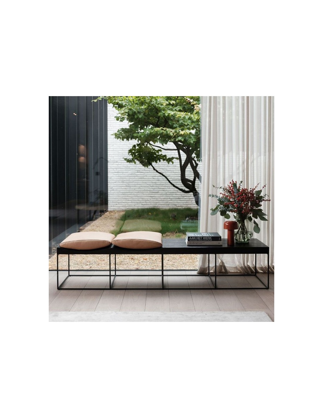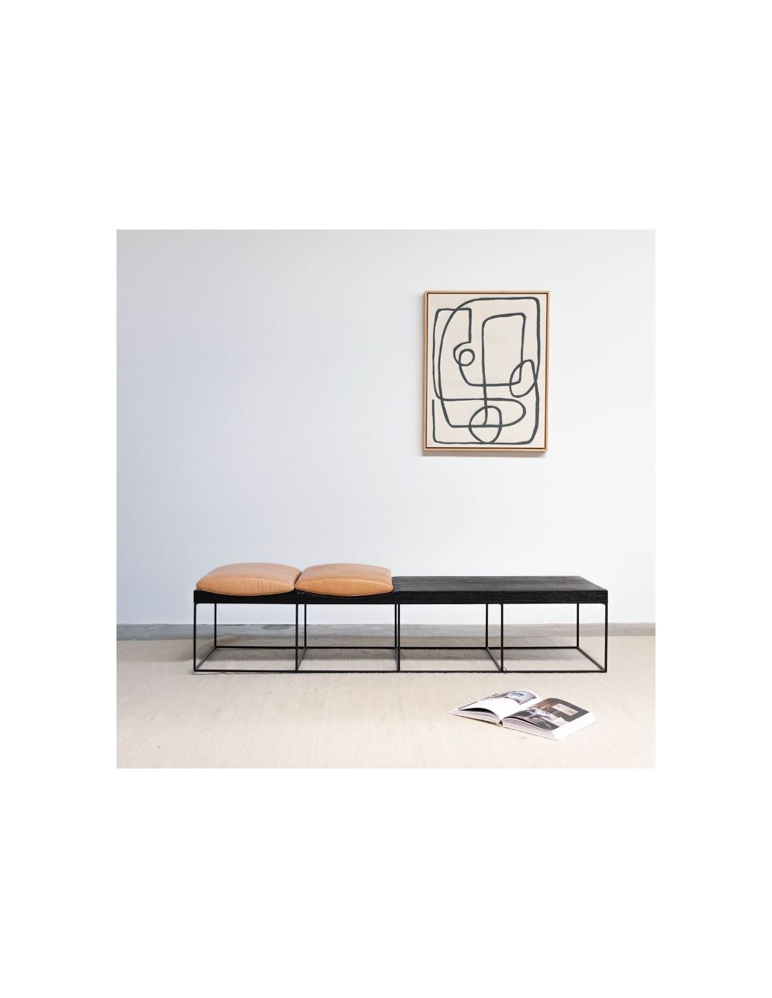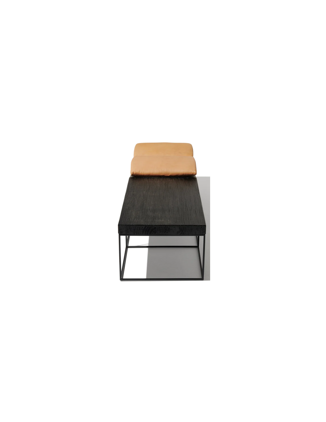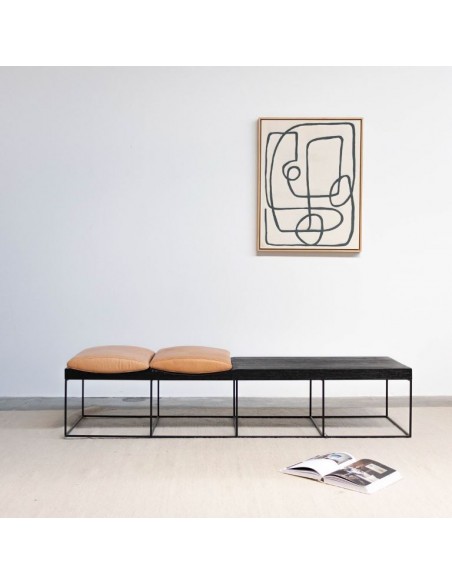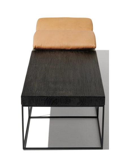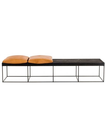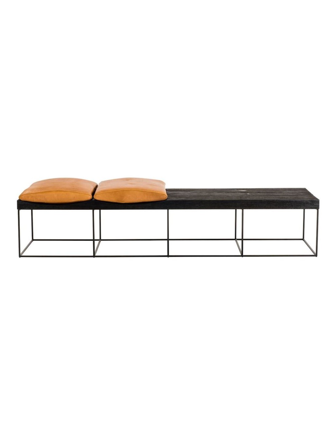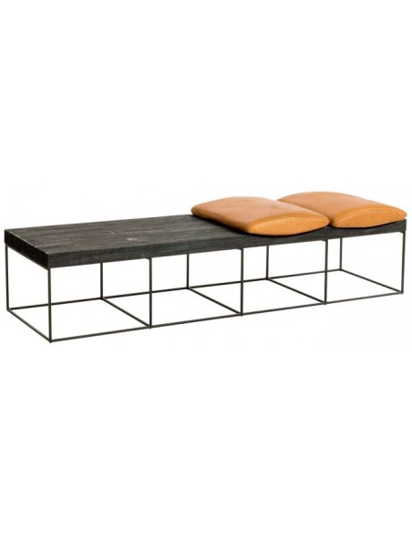 Bænk udført i et moderne design af sortlakeret metal, antik sortlakeret finér og cognac farvet læder. Bænken måler 38 cm i højden og 180 x 50 cm i bredde og dybde.
