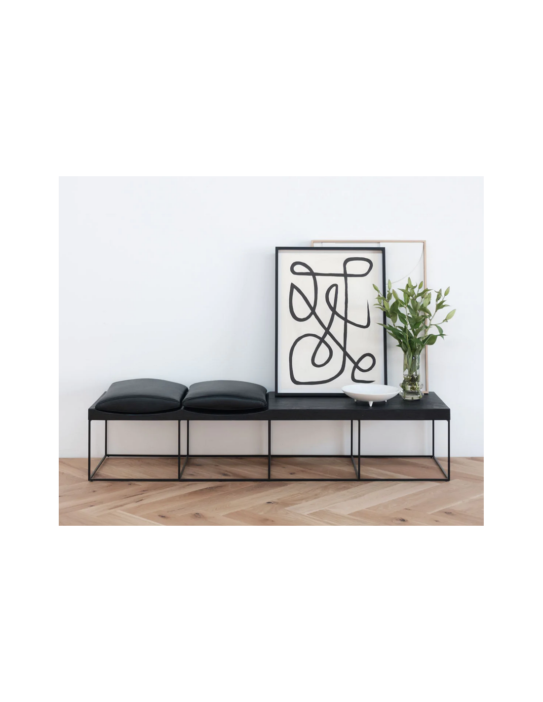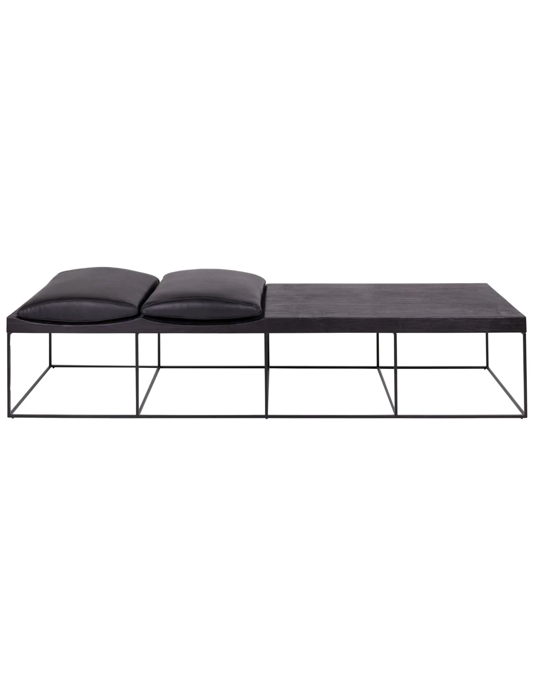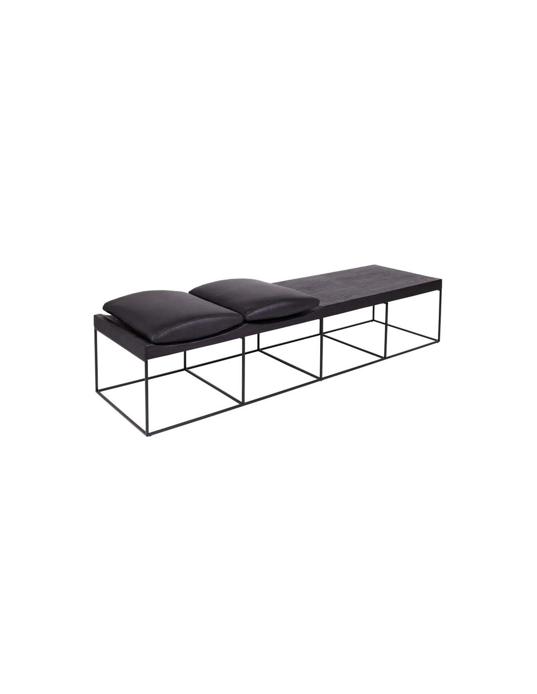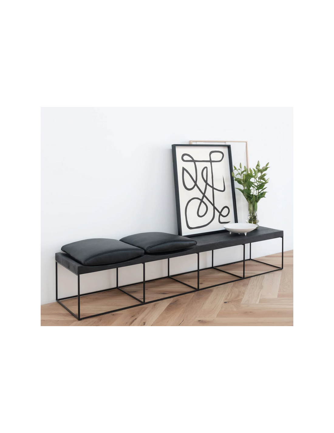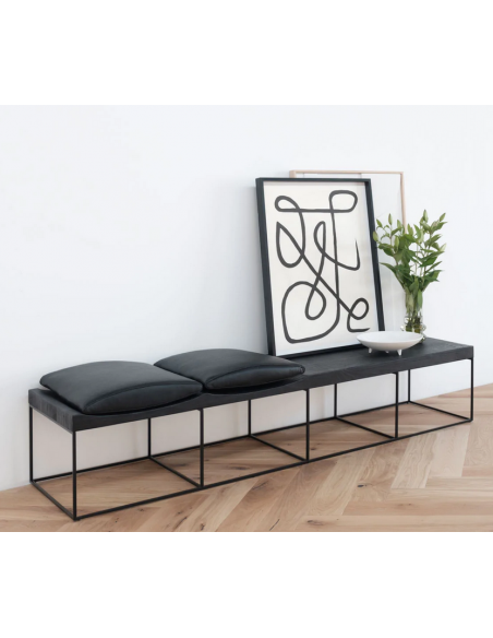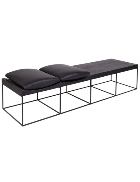 Bænk udført i et moderne design af sortlakeret metal, antik sortlakeret finér og sort læder. Bænken måler 38 cm i højden og 180 x 50 cm i bredde og dybde.