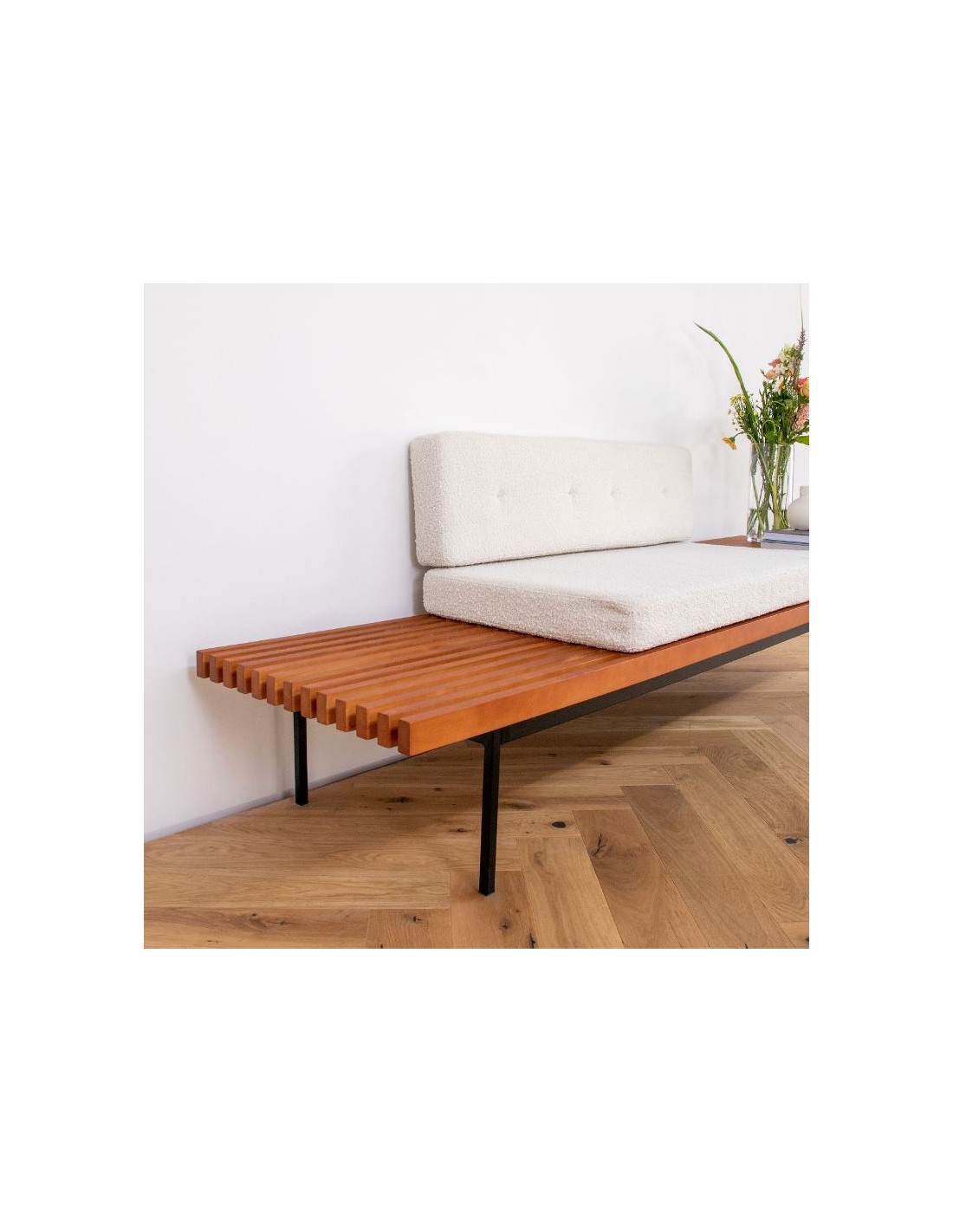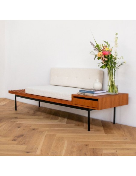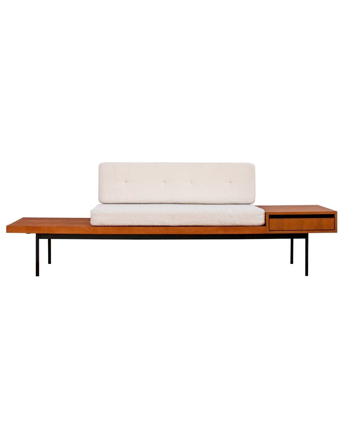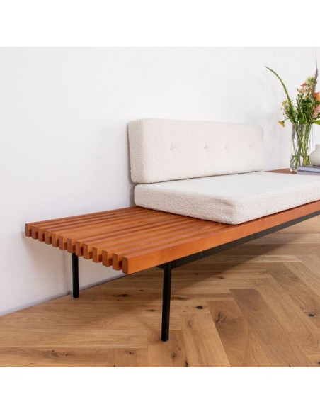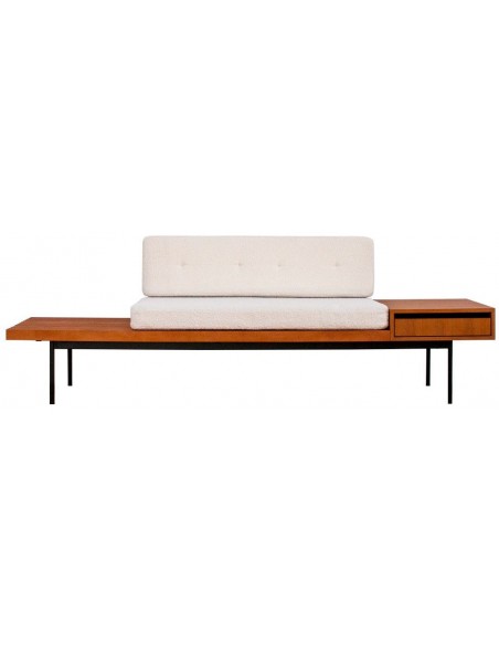 Bænk udført i et moderne design af sortlakeret metal, teak finér og beige bouclé polyester. Bænken måler 78 cm i højden og 230 x 70 cm i bredde og dybde.