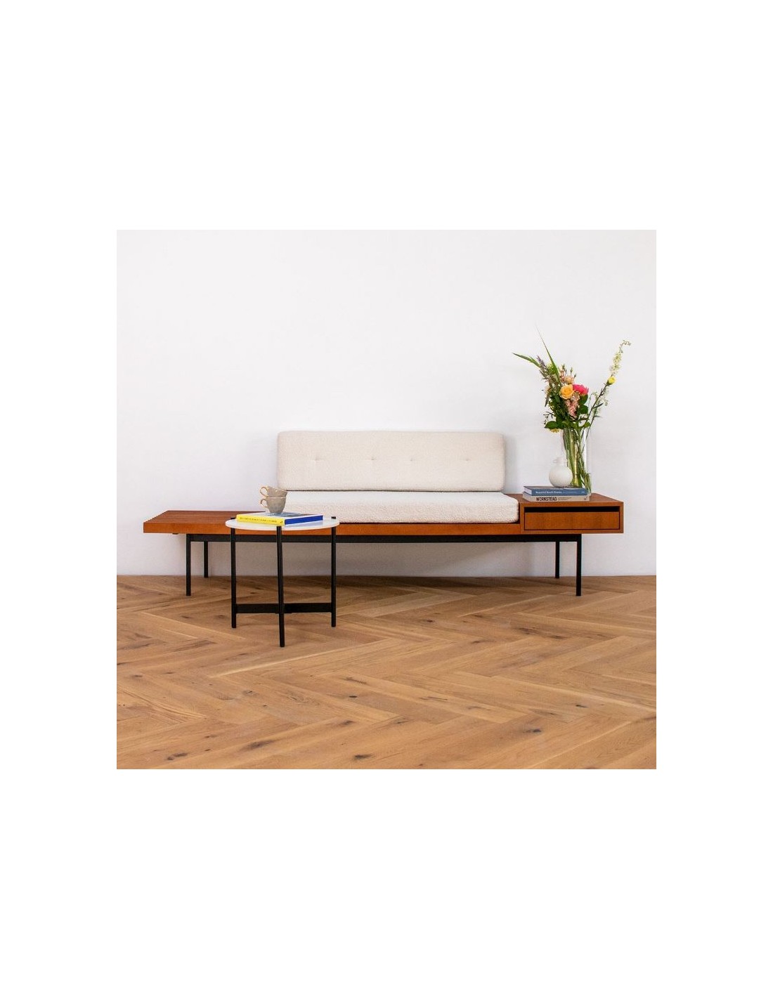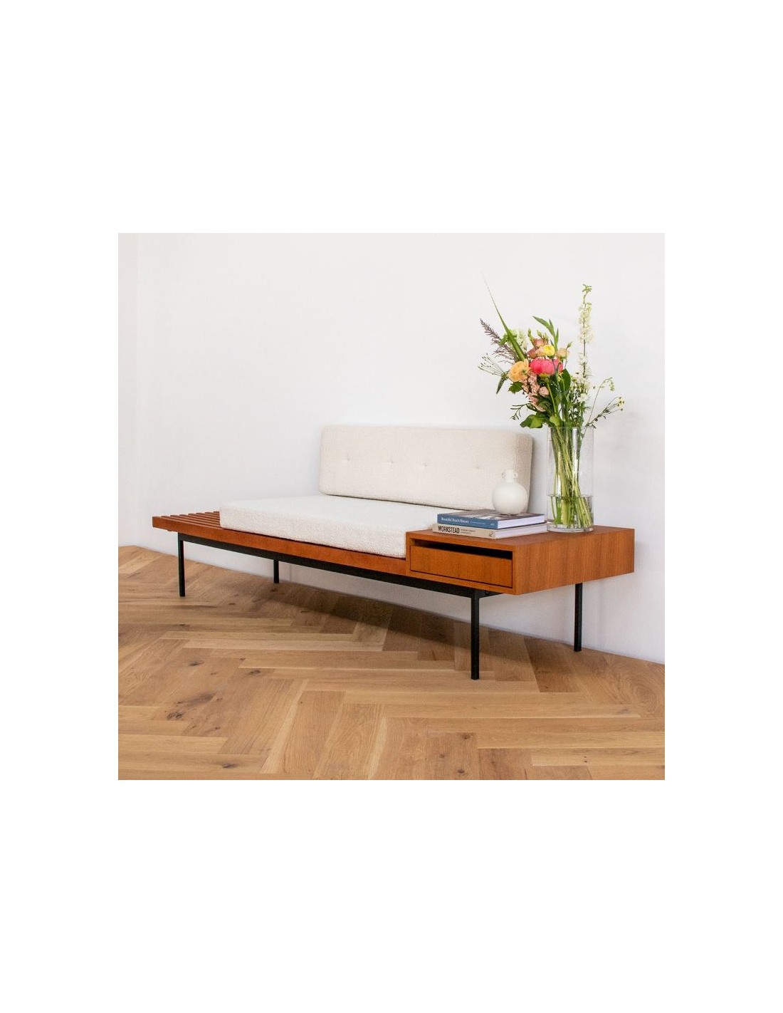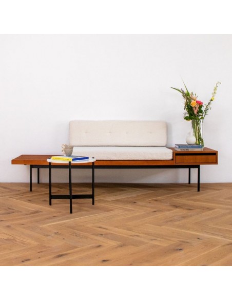 Amsterdam bænk i metal, teak finér og bouclé B230 cm - Sort/Teak/Beige