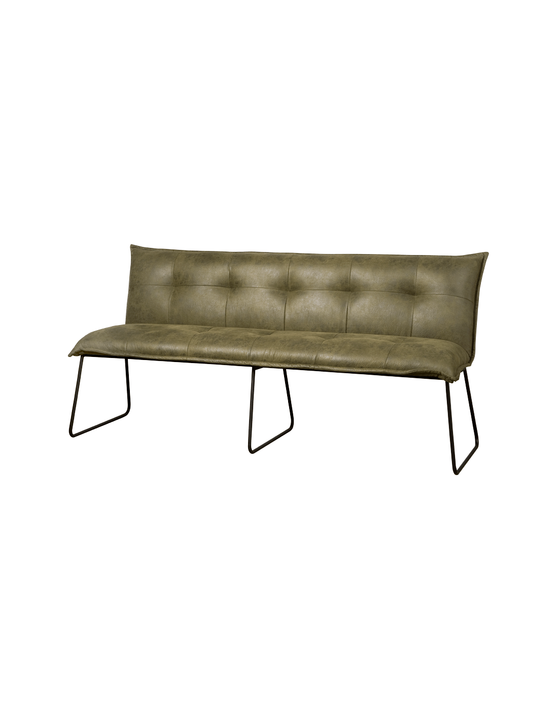 Spisebænk udført i et industrielt design af vintage grøn microfiber og stel i sortlakeret metal. Bænken måler 185 cm i bredden og 90 cm i højden og er polstret med højkvalitets skum.