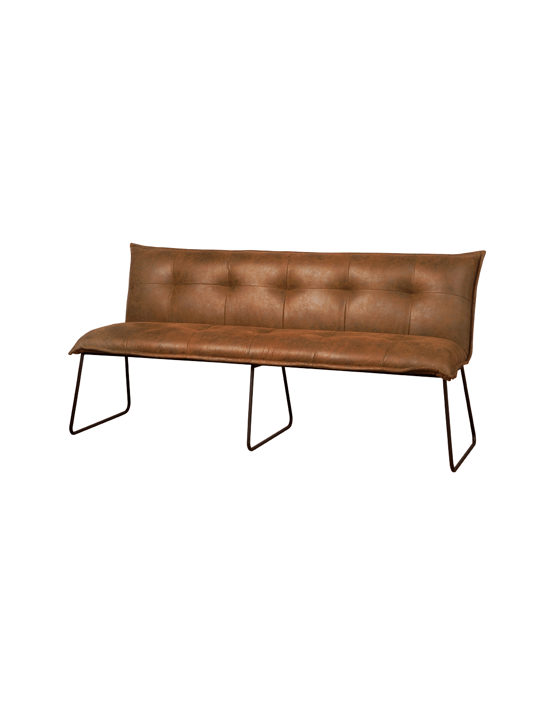 Spisebænk udført i et industrielt design af vintage cognac microfiber og stel i sortlakeret metal. Bænken måler 185 cm i bredden og 90 cm i højden og er polstret med højkvalitets skum.