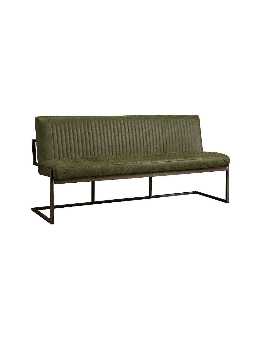 Spisebænk udført i et industrielt design af vintage grøn microfiber og stel i antik metalgrå metal. Bænken måler 185 cm i bredden og 87 cm i højden og er polstret med højkvalitets skum.