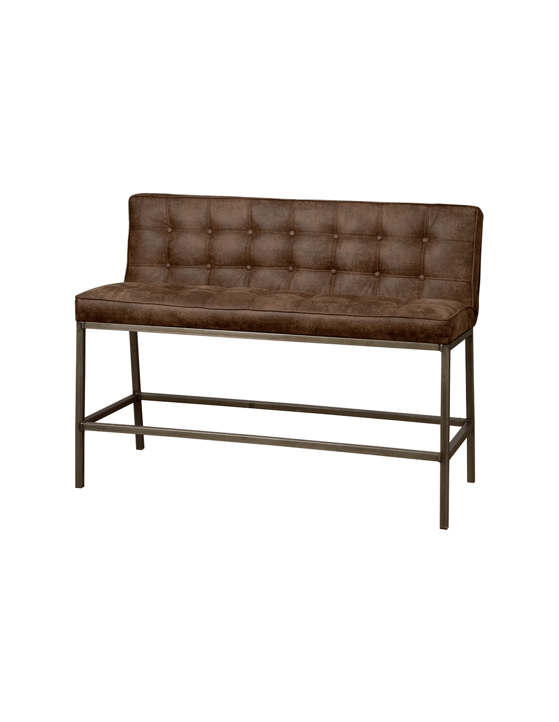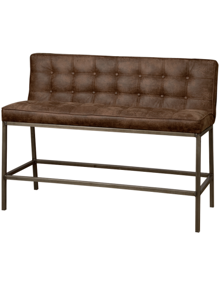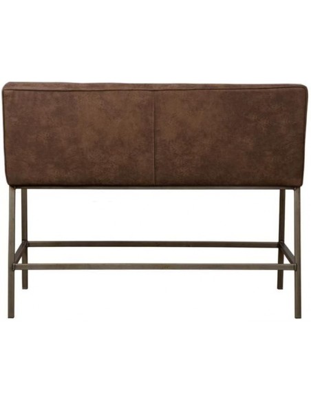 Bar bænk udført i et industrielt design af vintage brun microfiber og stel i antik metalgrå metal. Bænken måler 110 cm i bredden og 100 cm i højden og er polstret med højkvalitets skum.
