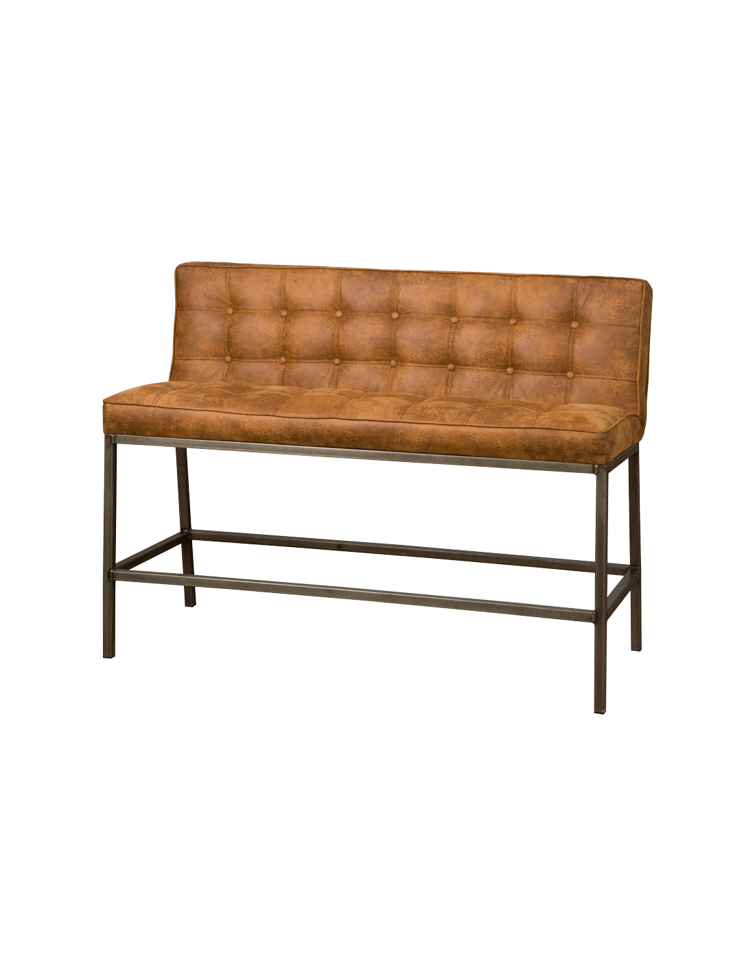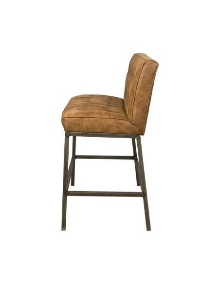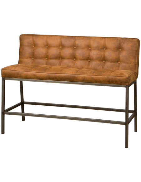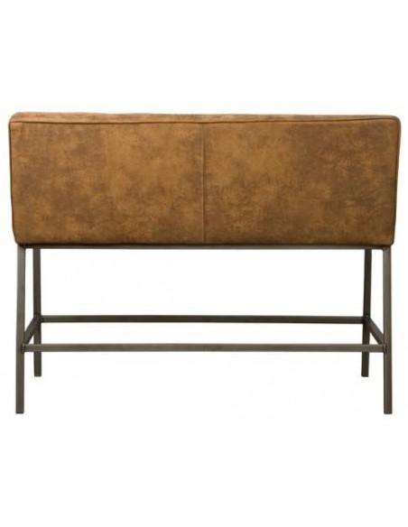 Bar bænk udført i et industrielt design af vintage cognac microfiber og stel i antik metalgrå metal. Bænken måler 110 cm i bredden og 100 cm i højden og er polstret med højkvalitets skum.