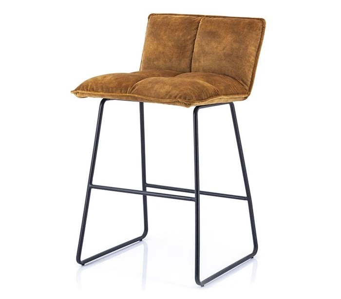 Sæt med 2 barstole i et moderne design, fremstillet i okkerfarvet polyester med coating (føles som ruskind) og med stel i sortlakeret metal. Stolen måler 87 cm i højden og med siddehøjde på 64 cm.