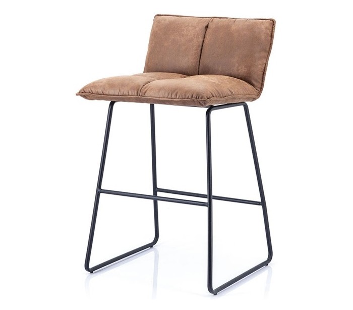 Sæt med 2 barstole i et moderne design, fremstillet i cognacfarvet polyester med coating (føles som ruskind) og med stel i sortlakeret metal. Stolen måler 87 cm i højden og med siddehøjde på 64 cm.