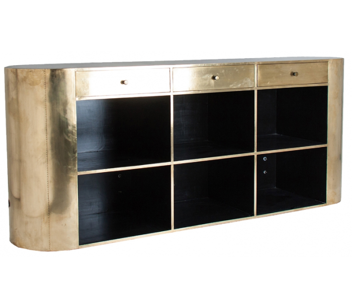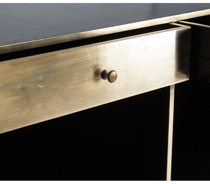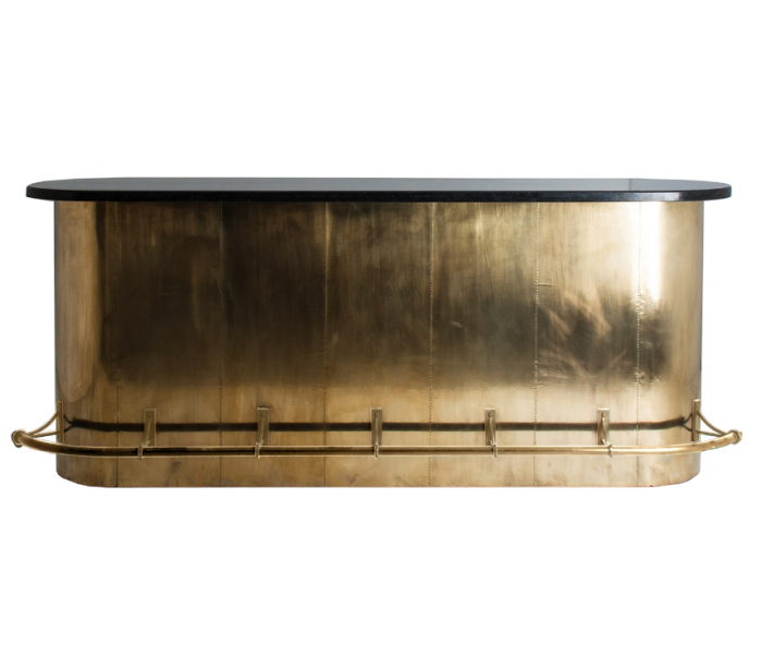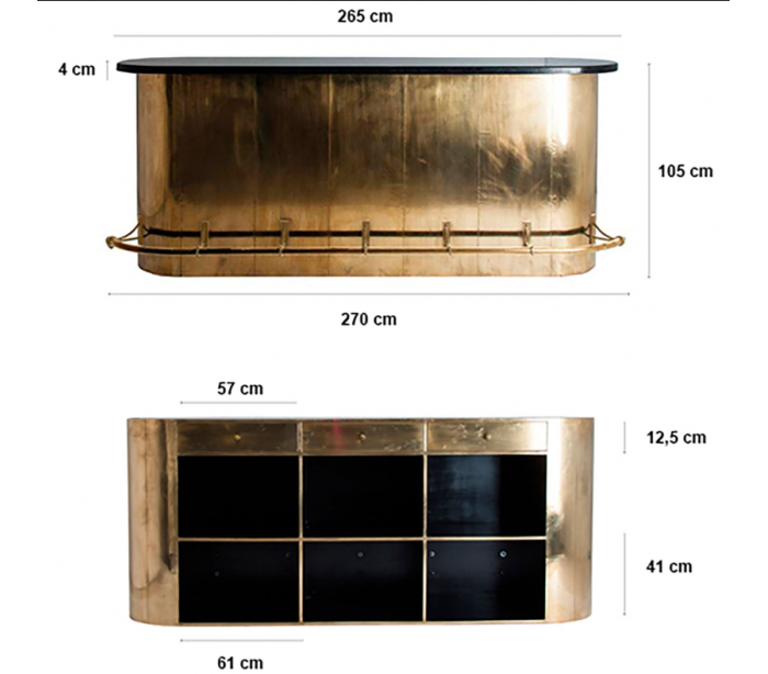 Bardisk i et industrielt design, håndlavet i EU af vintage messing og sort marmor. Disken måler 105 cm på højeste del, 250 cm i bredden og 75 cm i dybden. På den bagsiden er der 6 hylderum og 3 skuffer.