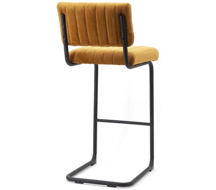 Barstol i et moderne design, fremstillet i okker farvet velour og med stel i sortlakeret metal. Stolen måler 104 cm i højden og med siddehøjde på 77 cm.