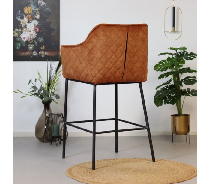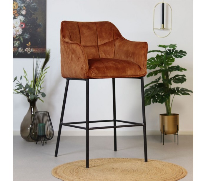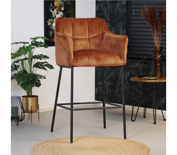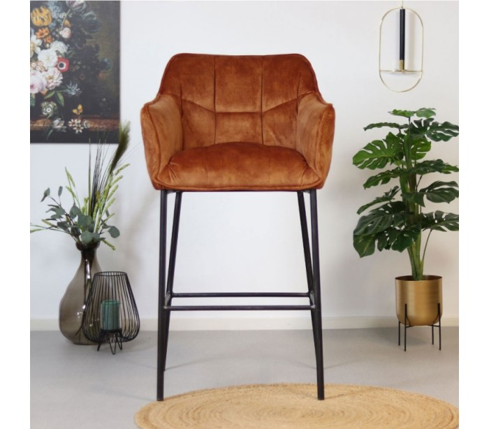 Jayron barstol i et moderne design, fremstillet med sæde i kobberfarvet velour og ben i sortlakeret metal. Barstolen måler 110 cm i højden over ryggen og med siddehøjde på 82 cm. Velouren er vandafvisende og med martindale 100.000, som gør stolen særligt anvendelig til restaurationer/spisesteder.