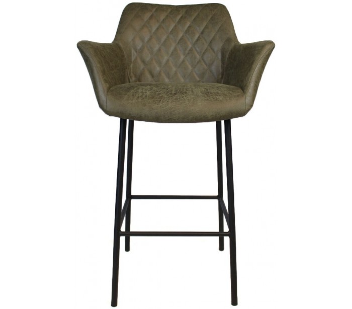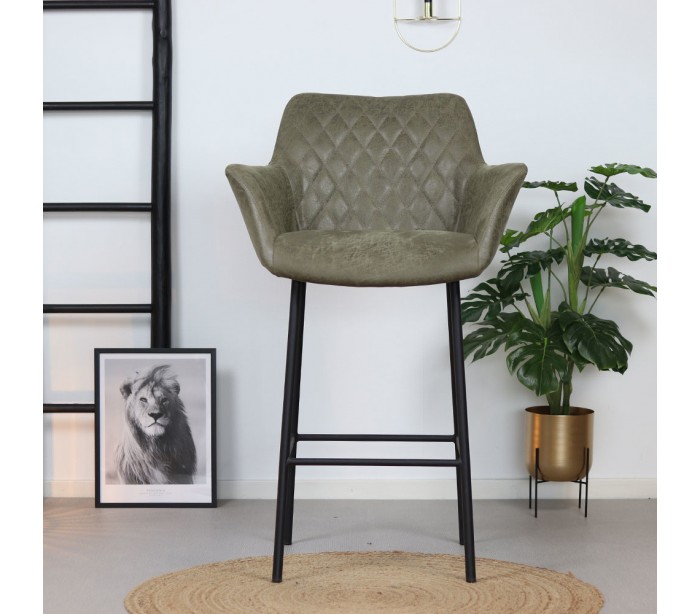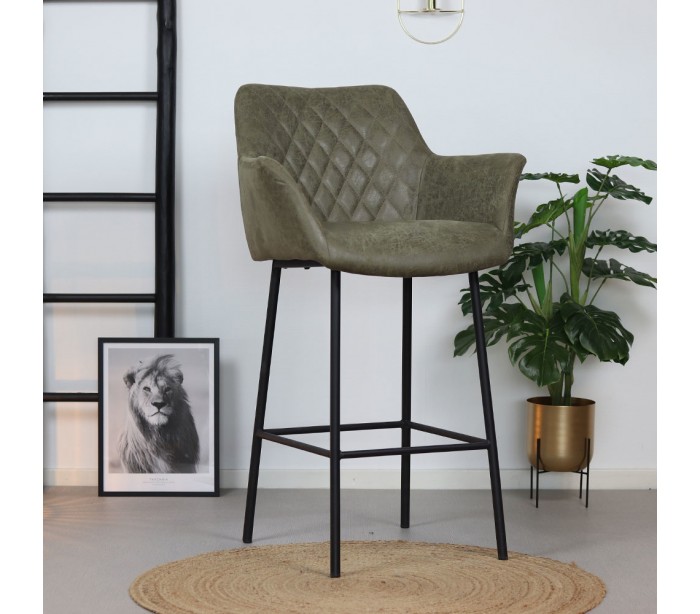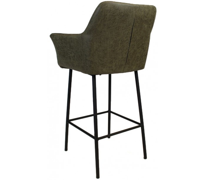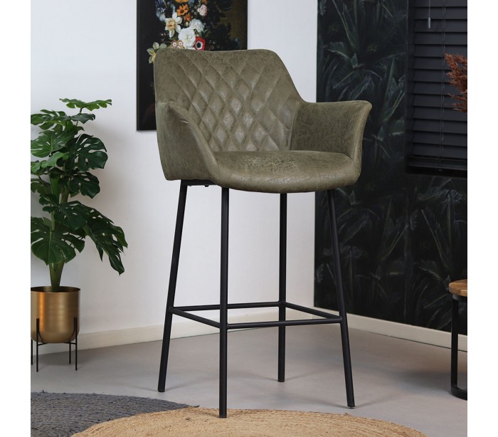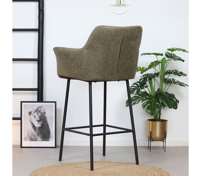 Club barstol i et moderne design, fremstillet med sæde i olivengrøn øko-læder (30% Polyester/70% Læder) og ben i sortlakeret metal. Barstolen måler 108 cm i højden over ryggen og med siddehøjde på 78 cm. Læderet er vandafvisende og med martindale 45.000, som gør stolen særligt anvendelig til restaurationer/spisesteder.