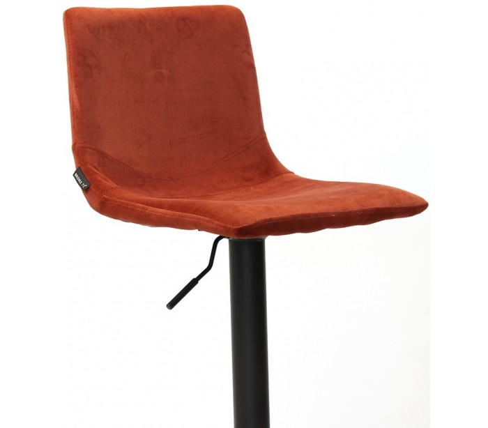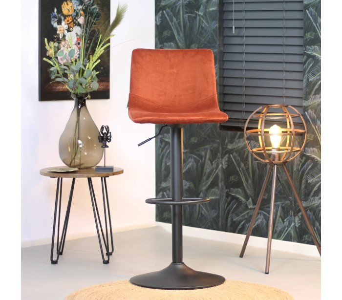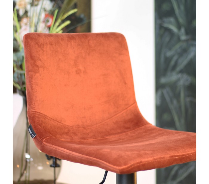 Frenkie barstol i et moderne design, fremstillet med sæde i kobberfarvet velour og ben i sortlakeret metal. Barstolen måler 90 - 110 cm i højden over ryggen og med siddehøjde på 59 - 79 cm. Højden justeres via håndtag under sæde. Velouren er vandafvisende og med martindale 70.000, som gør stolen særligt anvendelig til restaurationer/spisesteder.