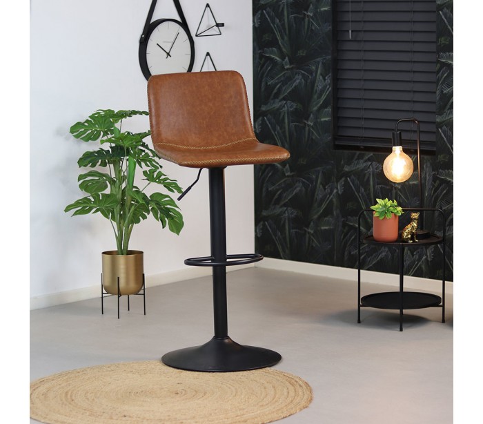 Tex barstol i et design fremstillet i cognac øko-læder (30% Polyester/70% Læder) og ben i sortlakeret metal. Barstolen måler 88 - 110 cm i højden over ryggen og med siddehøjde på 60 - 82 cm. Højden justeres via håndtag under sæde. Beklædning er vandafvisende og med martindale 45.000, som gør stolen særligt anvendelig til restaurationer/spisesteder.