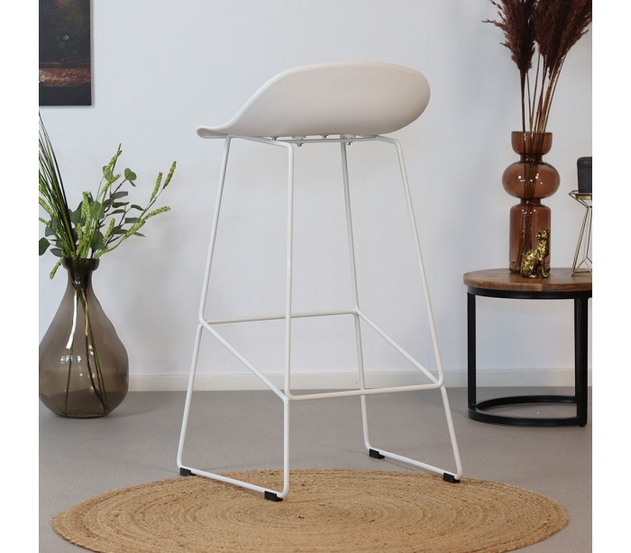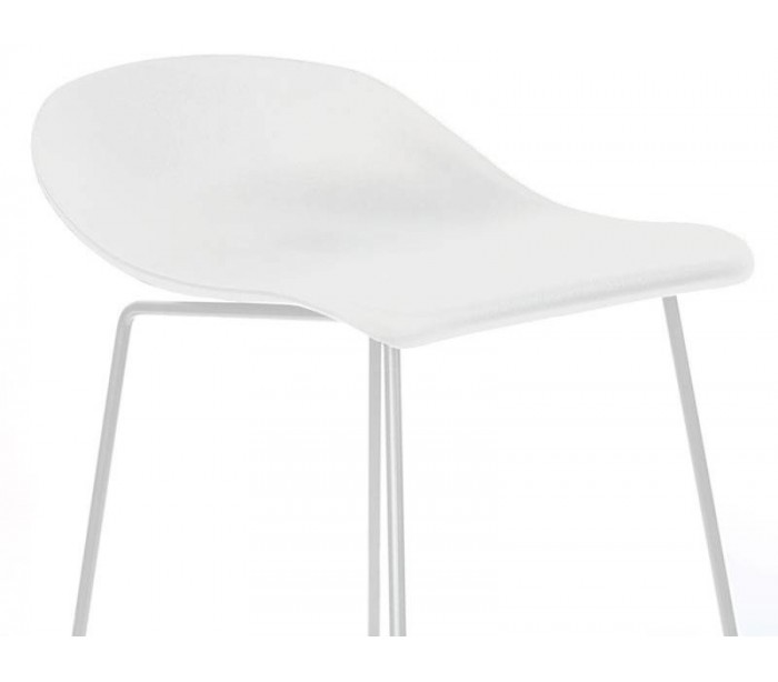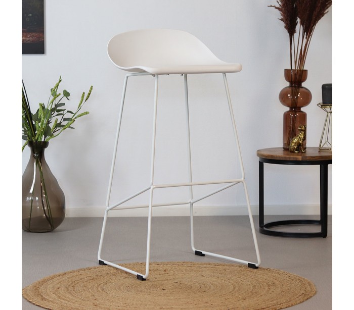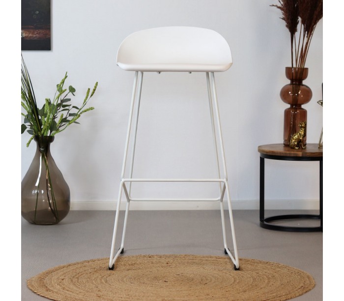 Erica barstol i et design fremstillet i hvid polypropylen og ben i hvidlakeret metal. Barstolen måler 89 cm i højden over ryggen og med siddehøjde på 76 cm.