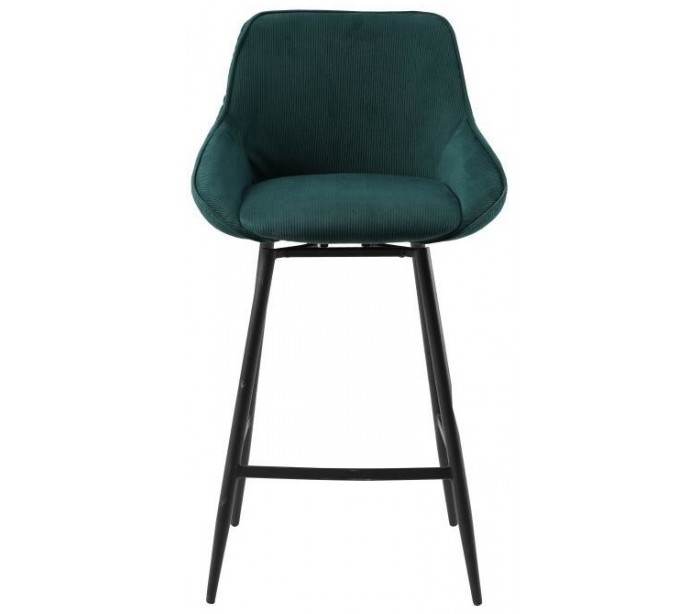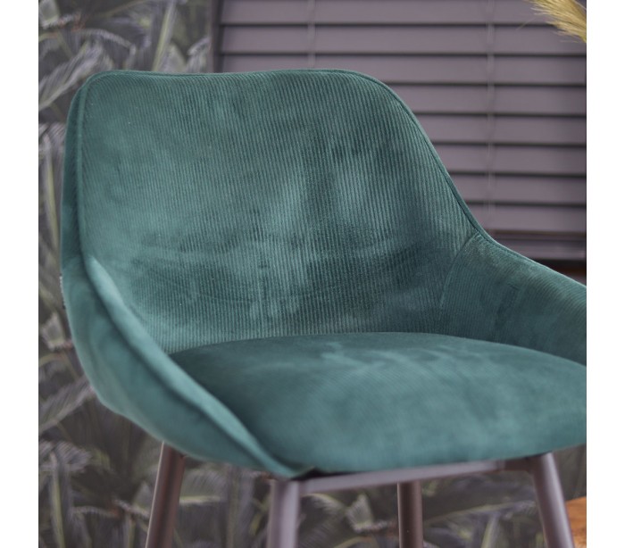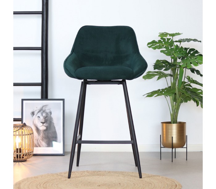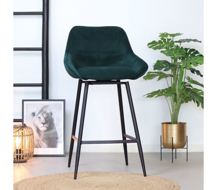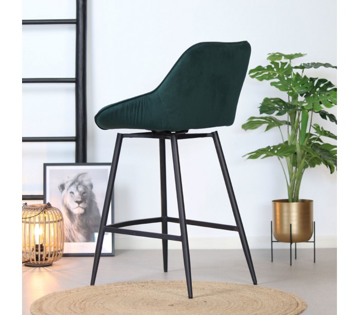 Luna rotérbar barstol i et moderne design, fremstillet med sæde i mørkegrøn ripcurl (bølget velour) og stel i sortlakeret metal. Stolen måler 96 cm i højden over ryggen og med siddehøjde på 70 cm. Betrækket er med martindale 40.000 og er vandafvisende, som gør stolen særligt anvendelig til restaurationer/spisesteder.