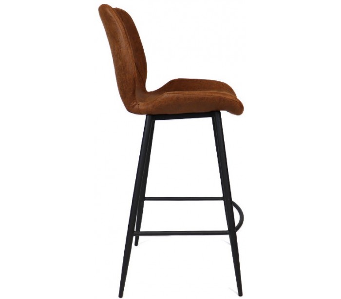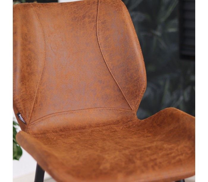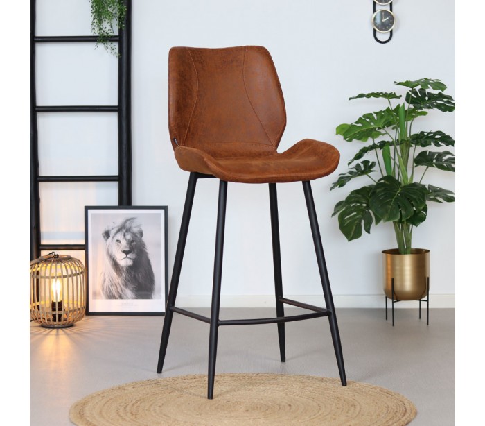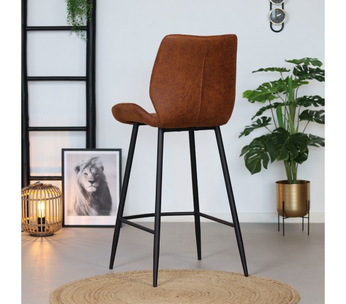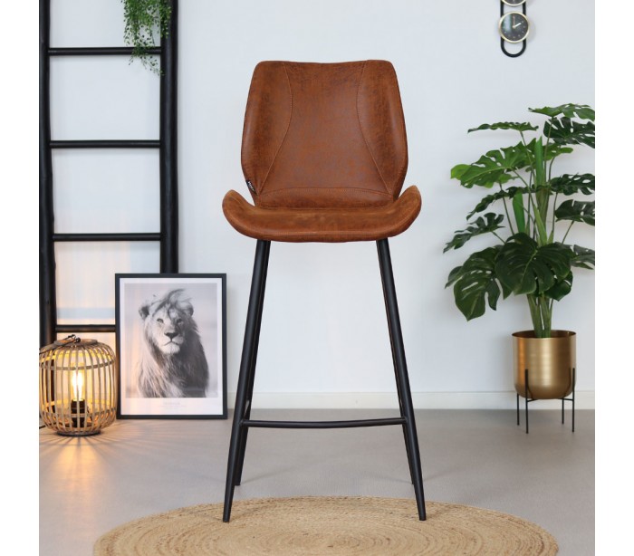 Barrel barstol i et moderne design, fremstillet med sæde i cognac øko-læder (30% Polyester/70% Læder) og ben i sortlakeret metal. Barstolen måler 104 cm i højden over ryggen og med siddehøjde på 69 cm. Læderet er vandafvisende og med martindale 45.000, som gør stolen særligt anvendelig til restaurationer/spisesteder.