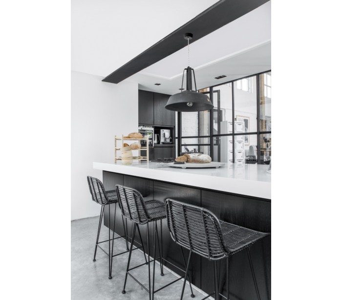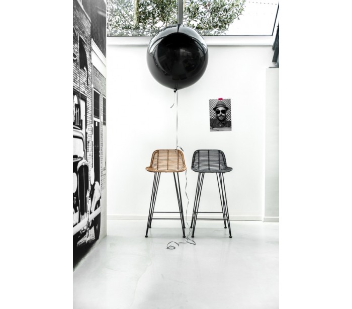 Barstol i et design fremstillet i sortlakeret metal og sort rattan. Stolen måler 89 cm i højden over ryggen og med en siddehøjde på 66,5 cm.