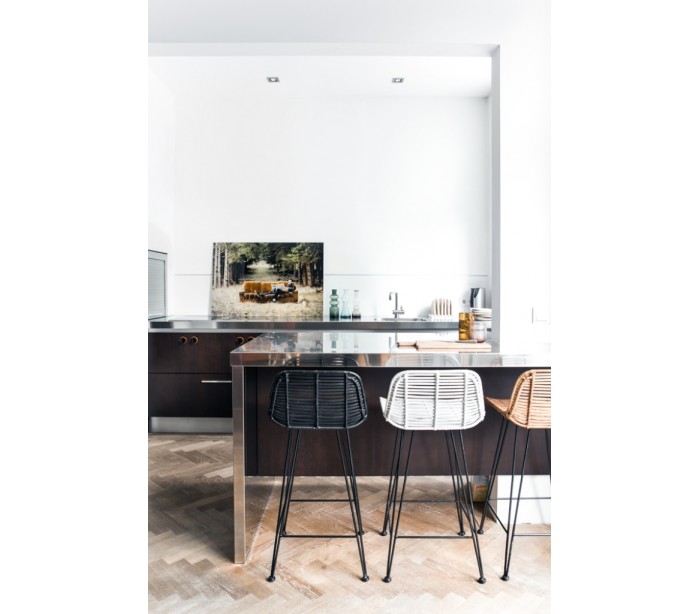 Barstol i et design fremstillet i sortlakeret metal og naturfarvet rattan. Stolen måler 89 cm i højden over ryggen og med en siddehøjde på 66,5 cm.