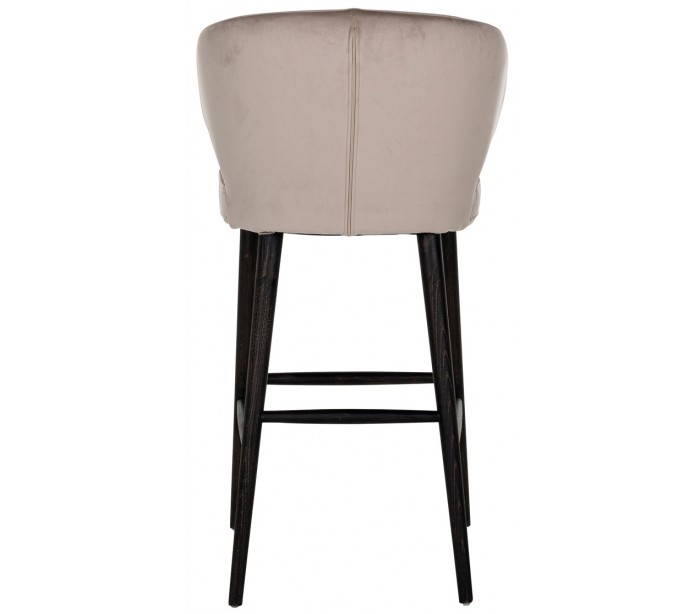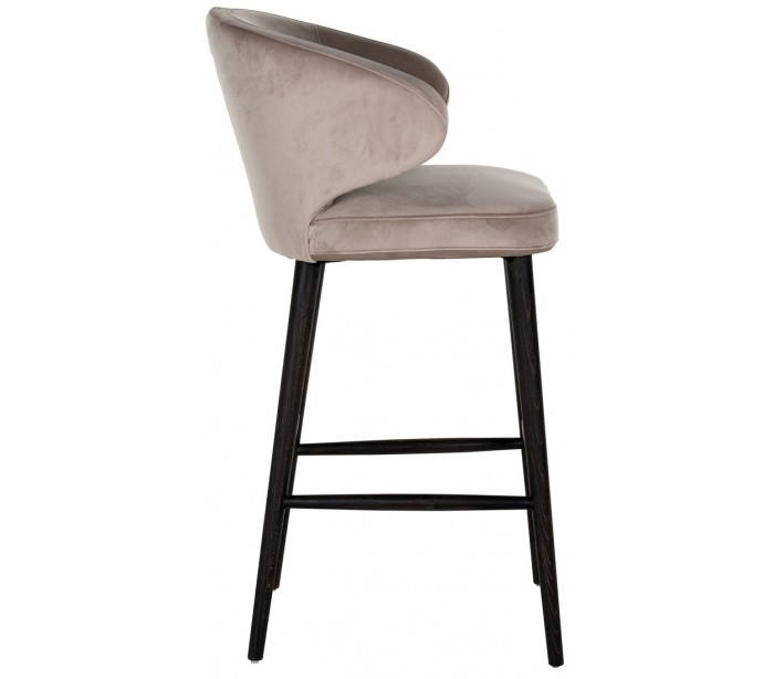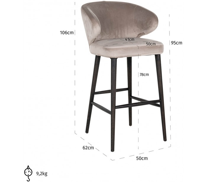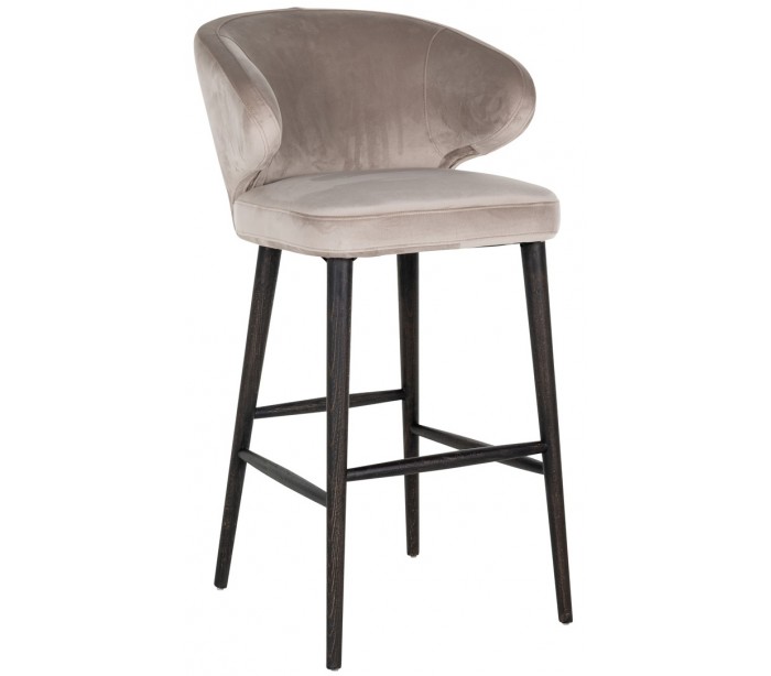Barstol i et design fra hollandske Richmond Interiors. Stolen er fremstillet i khakifarvet velour og med ben i sortlakeret bøgetræ med tydelige træstruktur. Stolen måler 106 cm i højden over ryggen og 50 x 62 cm i bredde og dybde.