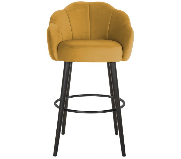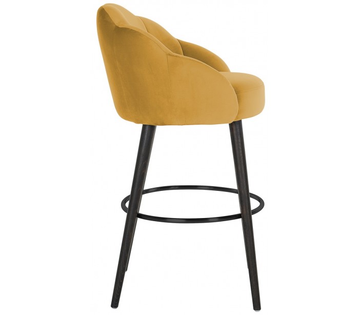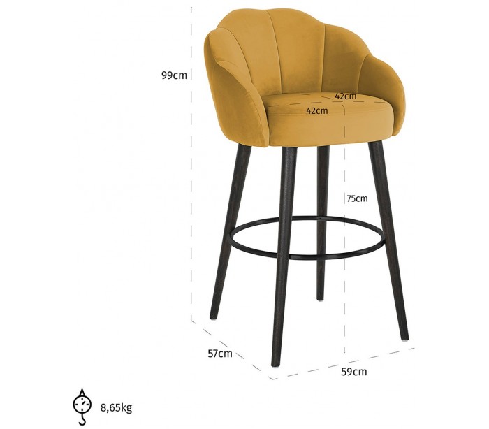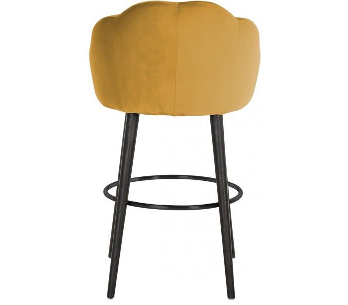 Barstol i et design fra hollandske Richmond Interiors. Stolen er fremstillet i okkerfarvet velour og med ben i sortlakeret bøgetræ med tydelige træstruktur. Stolen måler 99 cm i højden over ryggen og 59 x 57 cm i bredde og dybde.