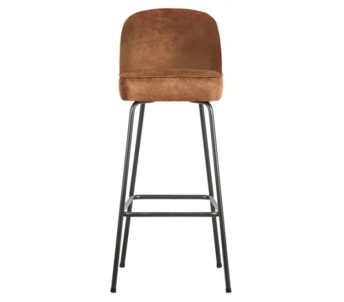 Barstol i et moderne design, fremstillet i vintage cognacfarvet læder (70% læder/30% polyester) og med ben i sortlakeret metal. Barstolen måler 103 cm i højden og 50 x 55 cm i bredde og dybde. Siddehøjden er 79 cm.