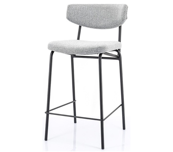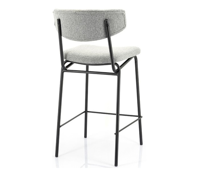 Barstol i et moderne design, fremstillet i grå polyester og sortlakeret metal. Stolen måler 92 cm i højden og med siddehøjde på 66 cm.