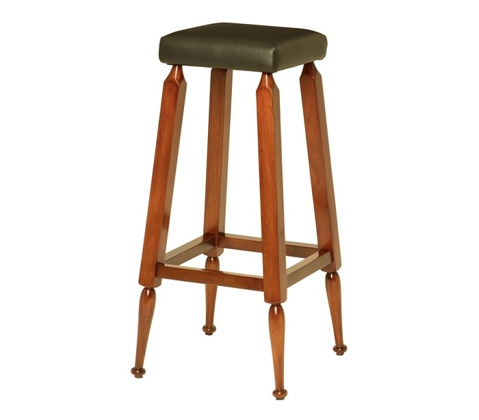 Barstol fra Authentic Models, udført i et design af honningbrun lakeret mahognitræ og sort PU-læder og måler 76 cm i højden.