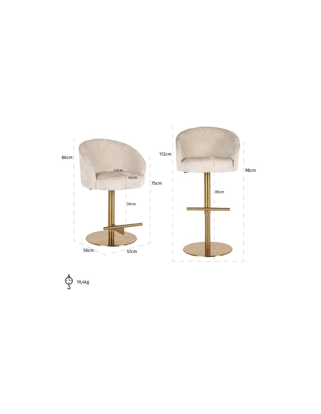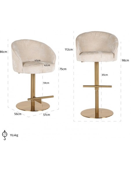 Zabi barstol i chenille H86-112 cm - Børstet messing/Beigehvid