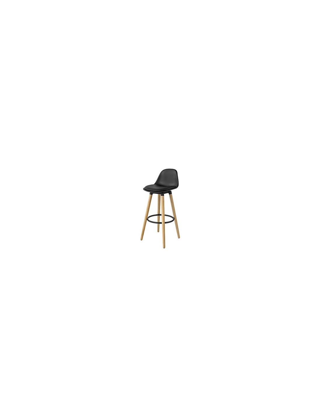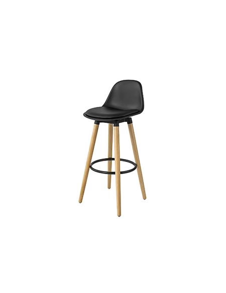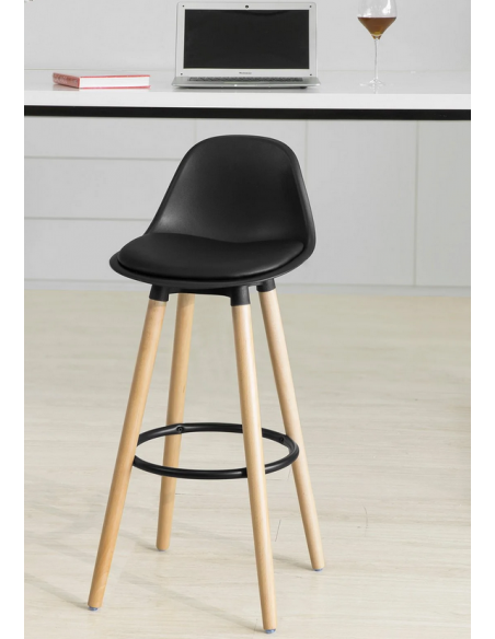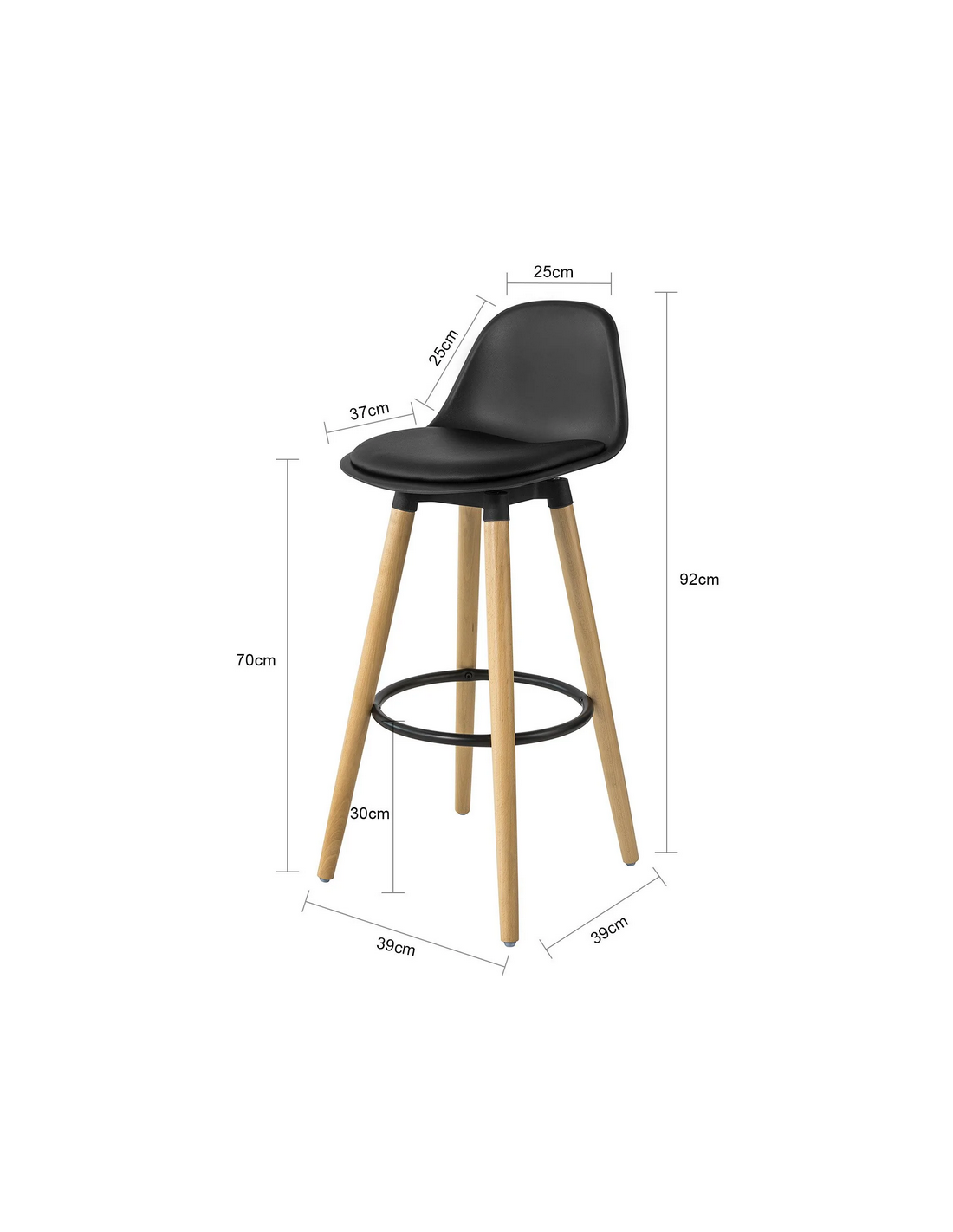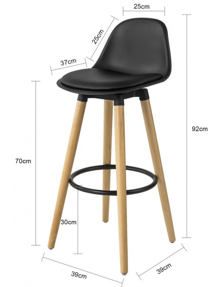 Barstol udført i et design af naturfarvet træ og sort kunststof med sæde i sort PU læder. Barstolen måler 92 cm i højden over ryggen og 39 x 39 cm i bredde og dybde. Siddehøjden er 70 cm.