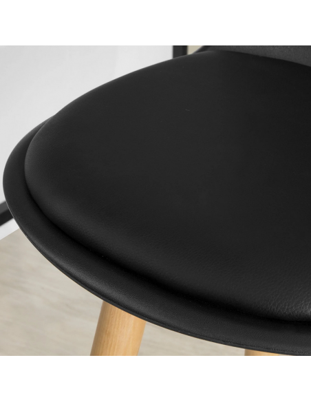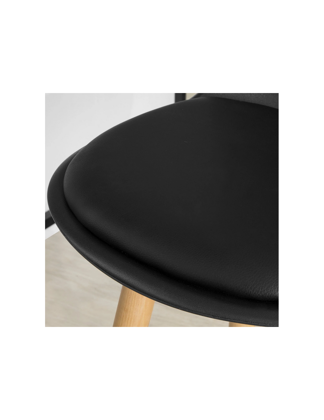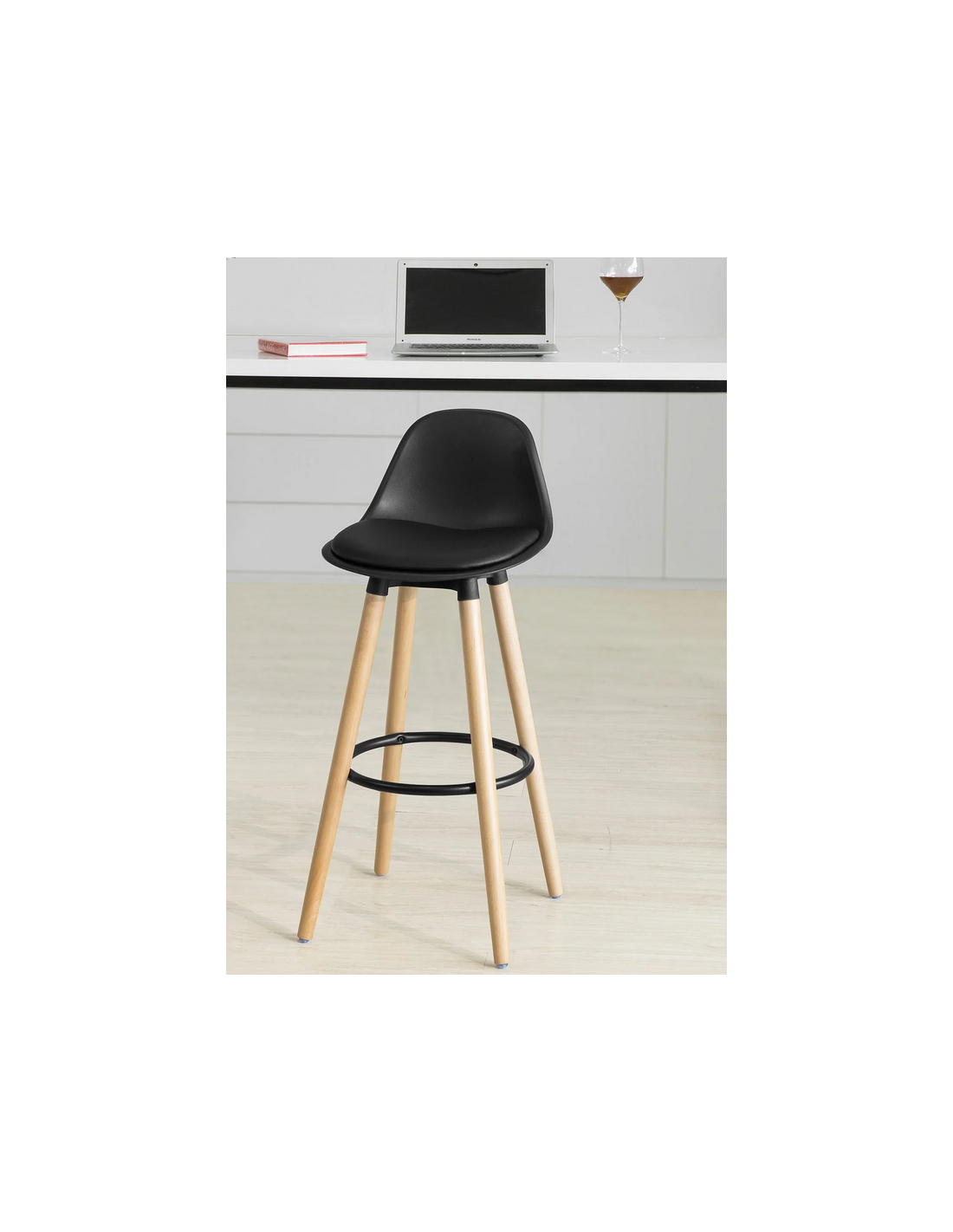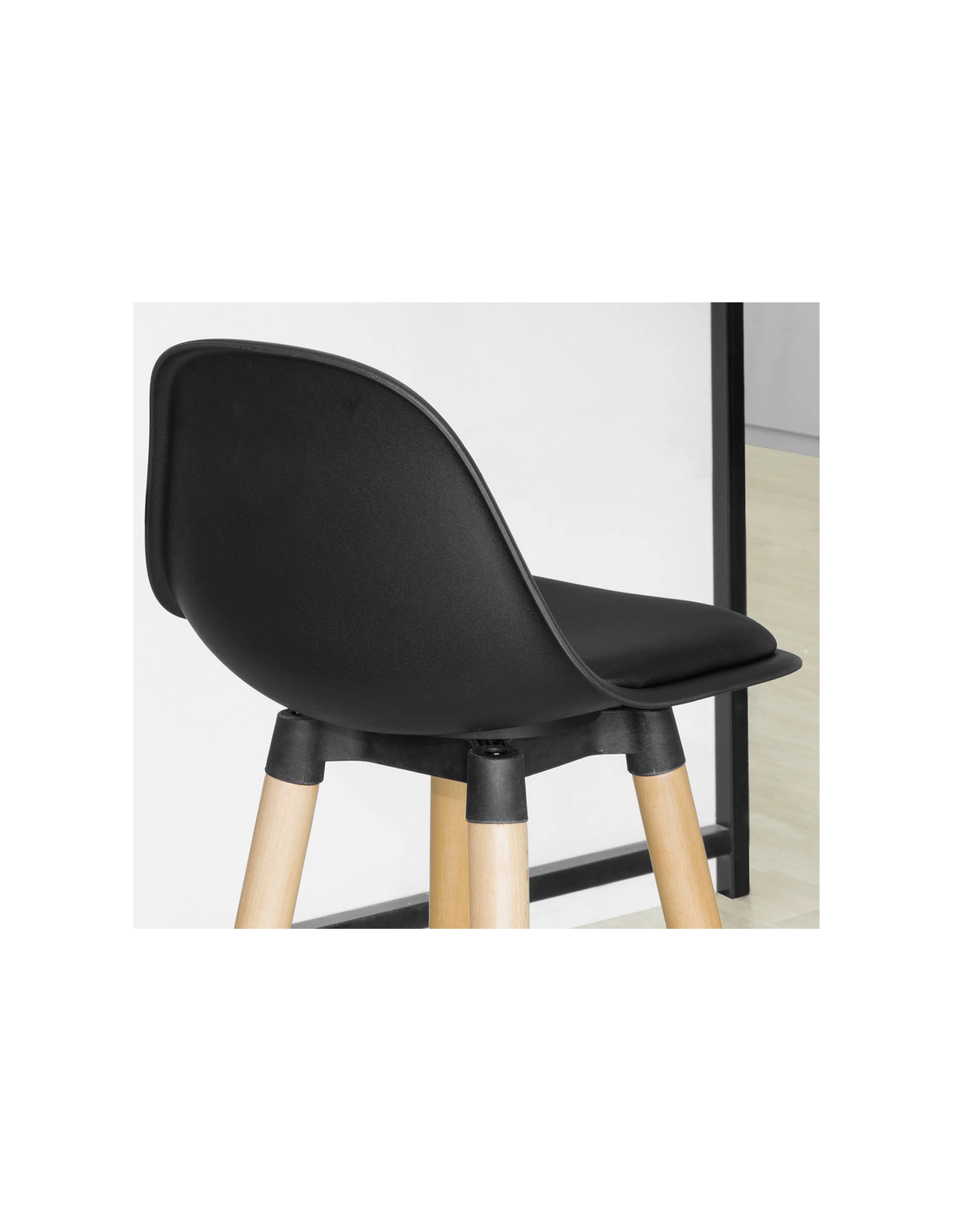 Barstol udført i et design af naturfarvet træ og sort kunststof med sæde i sort PU læder. Barstolen måler 92 cm i højden over ryggen og 39 x 39 cm i bredde og dybde. Siddehøjden er 70 cm.