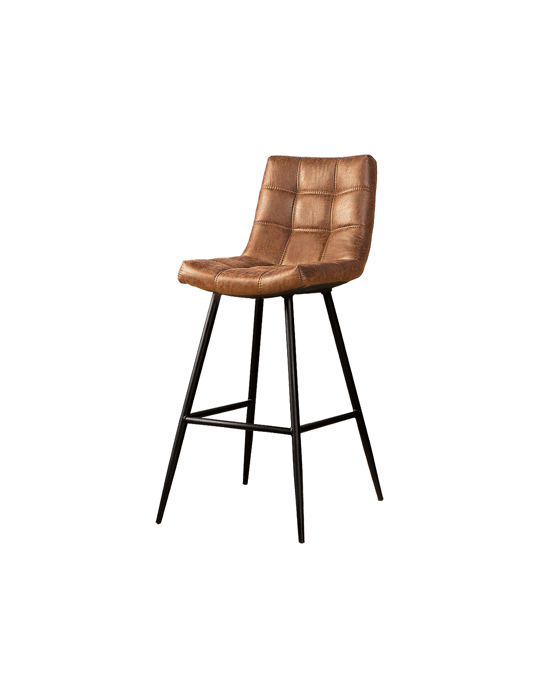 Barstol udført i et industrielt design af vintage cognac microfiber og stel i sortlakeret metal. Stolen måler 105 cm i højden over ryggen og 41 cm i bredden og er polstret med højkvalitets skum.