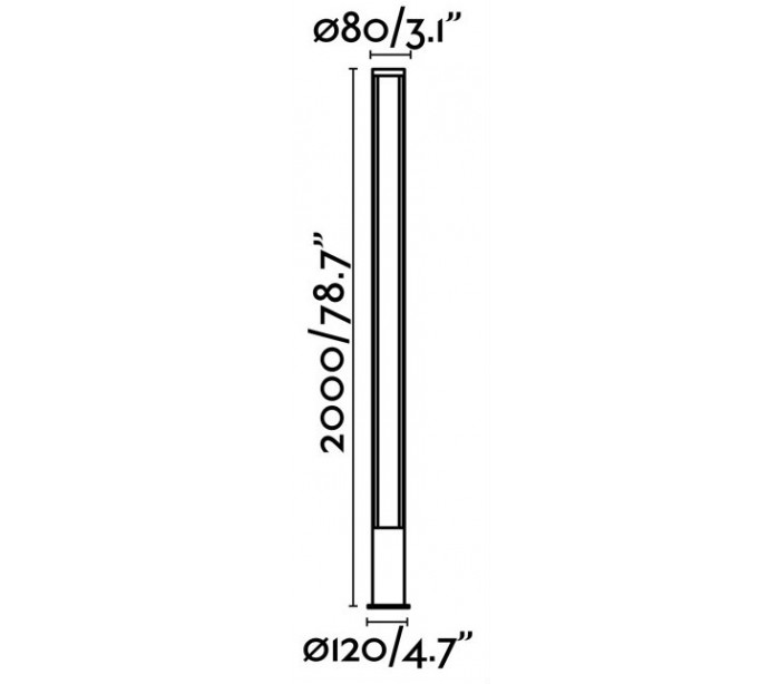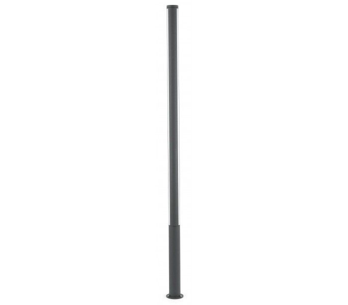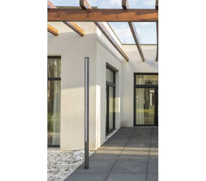 Grop havelampe i et moderne design, fremstillet i mørkegrå lakeret aluminium og skærm i hvid polycarbonat. Lampen måler 200 cm i højden og anvender 1 x SMD LED lyskilde på 27W (Inkl.). Lampen bør monteres på fast undergrund eller betonstøbning/flise.