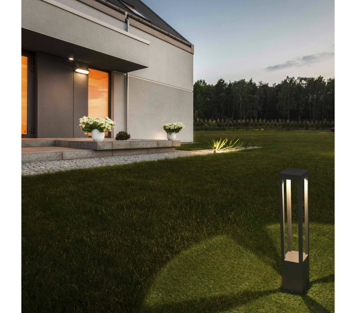 Agra havelampe i et moderne design, fremstillet i mørkegrå lakeret aluminium og skærm i klart glas. Lampen måler 65 cm i højden og anvender 1 x COB LED lyskilde på 10W (Inkl.). Lampen bør monteres på fast undergrund eller betonstøbning/flise.