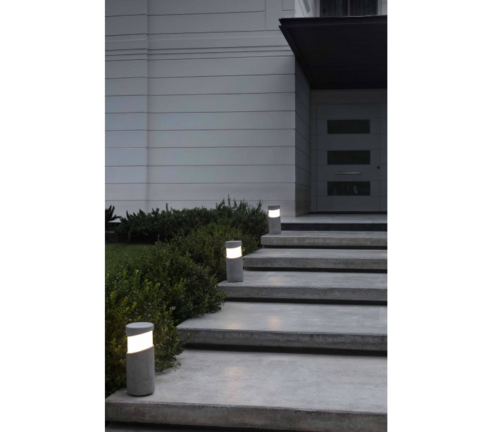 Block havelampe i et moderne design, fremstillet i grå beton og skærm i hvid akryl. Lampen måler 35 cm i højden og anvender 1 x E27 lyskilde på max. 15W (Ekskl.). Lampen bør monteres på fast undergrund eller betonstøbning/flise.
