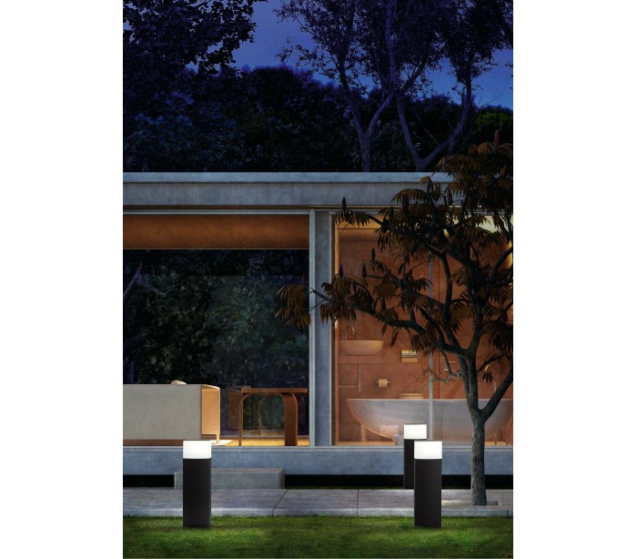 Datna havelampe i et moderne design, fremstillet i mørkegrå lakeret aluminium og skærm i hvid polycarbonat. Lampen måler 60 cm i højden og anvender 1 x E27 lyskilde på max. 20W (Ekskl.). Lampen bør monteres på fast undergrund eller betonstøbning/flise.