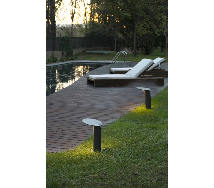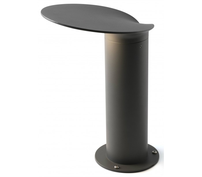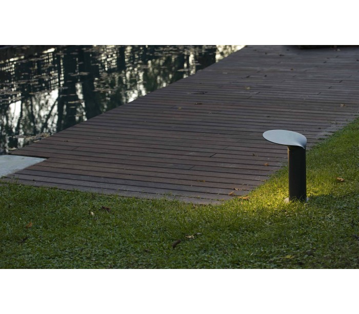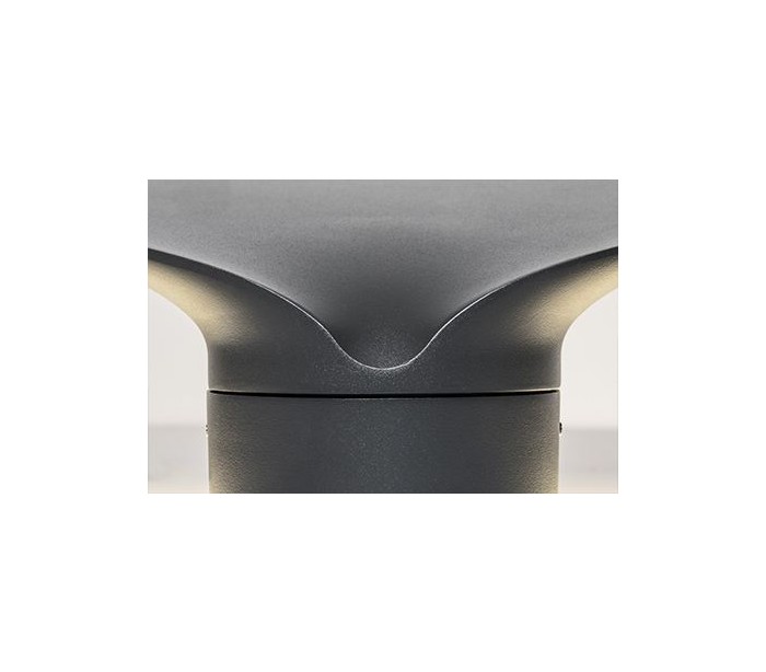 Lotus havelampe i et moderne design, fremstillet i mørkegrå lakeret aluminium og glas. Lampen måler 35 cm i højden og anvender 1 x COB LED lyskilde på 18W (Inkl.). Lampen bør monteres på fast undergrund eller betonstøbning/flise.