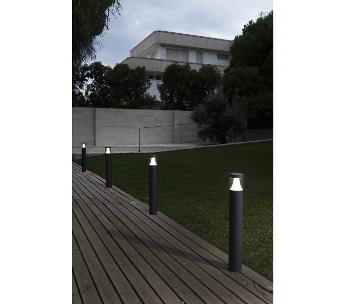 Plim havelampe i et moderne design, fremstillet i mørkegrå lakeret aluminium og polycarbonat. Lampen måler 65 cm i højden og anvender 1 x SMD LED lyskilde på 10W (Inkl.). Lampen bør monteres på fast undergrund eller betonstøbning/flise.