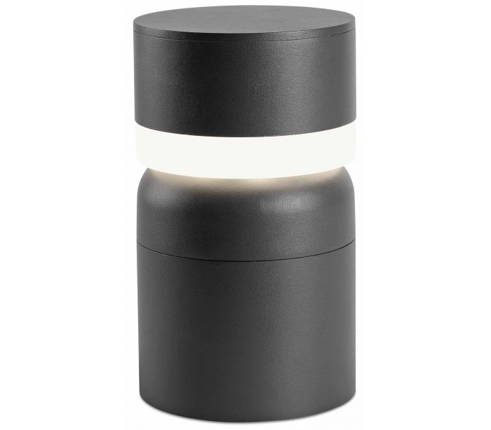 Sete havelampe i et moderne design, fremstillet i mørkegrå lakeret aluminium og skærm i hvid polycarbonat. Lampen måler 25 cm i højden og anvender 1 x SMD LED lyskilde på 6W (Inkl.). Lampen bør monteres på fast undergrund eller betonstøbning/flise.
