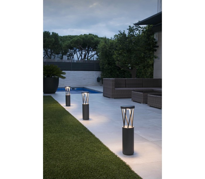 Twist havelampe i et moderne design, fremstillet i mørkegrå lakeret aluminium. Lampen måler 65 cm i højden og anvender 1 x SMD LED lyskilde på 10W (Inkl.). Lampen bør monteres på fast undergrund eller betonstøbning/flise.