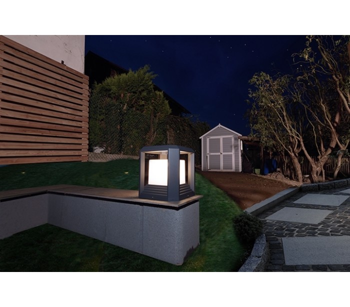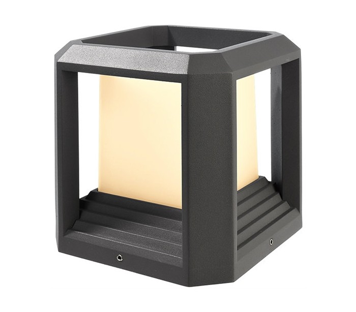 Moderne bedlampe i et design af antracitfarvet aluminimum. Lampen kommer med indbygget LED lyskilde på 12W og måler 16,1 cm i højden og 15 cm i bredde og dybde.