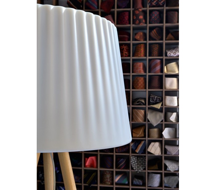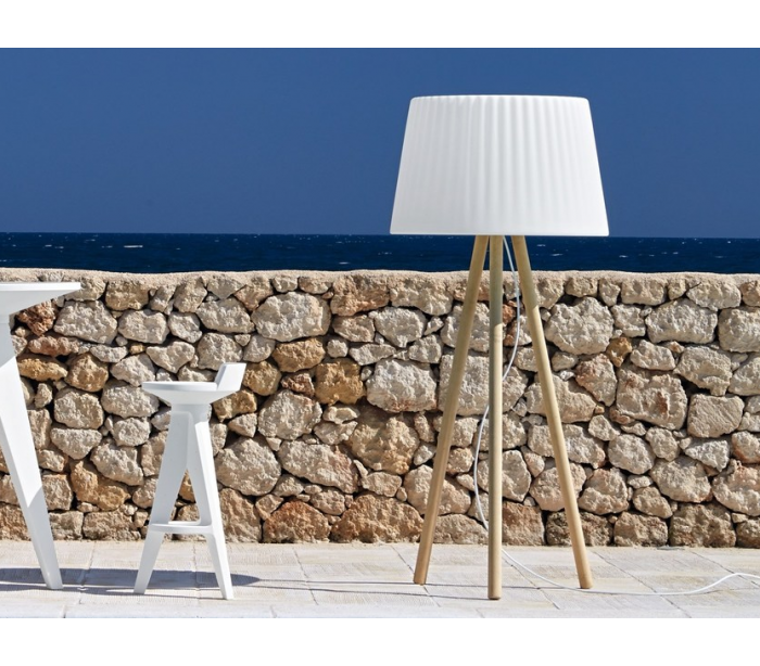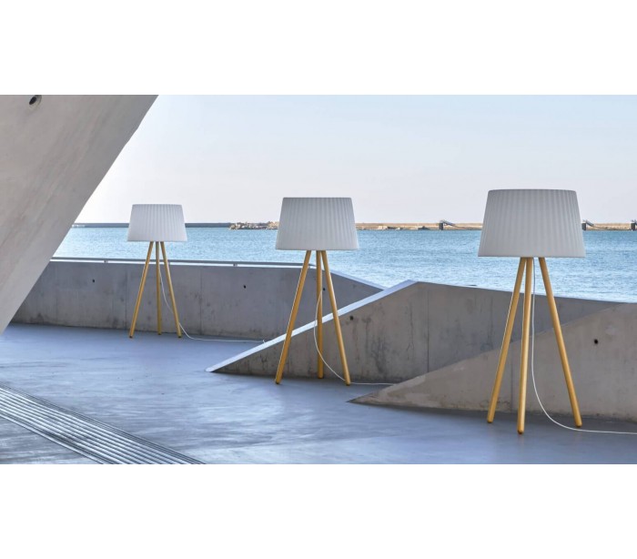 AGATA udendørs gulvlampe i et anderledes design, fremstillet i Poleasy materiale og med ben i massiv træ. Lampen måler 180 cm i højden og 80 cm i diameter. Lampen er designet af MoreDesign.