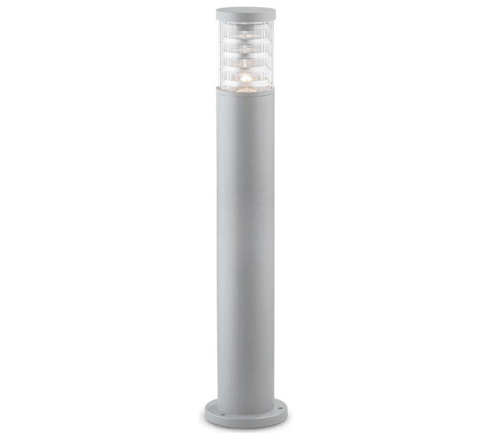 TRONCO udendørs bedlampe i et moderne design fremstillet i grålakeret aluminium og klart pyrexglas. Lampen måler 80,5 cm i højden og anvender 1 x E27 lyskilde (Ekskl.). Der medfølger monteringssæt til lampen, til montering på faste underflader.