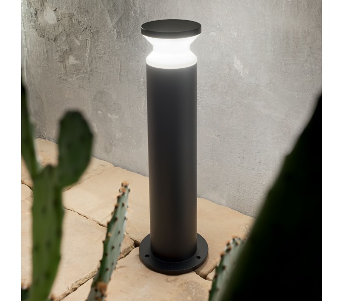 TORRE udendørs bedlampe i et moderne design fremstillet i sortlakeret aluminium og hvid plast. Lampen måler 60 cm i højden og anvender 1 x E27 lyskilde (Ekskl.). Der medfølger monteringssæt til lampen, til montering på faste underflader.