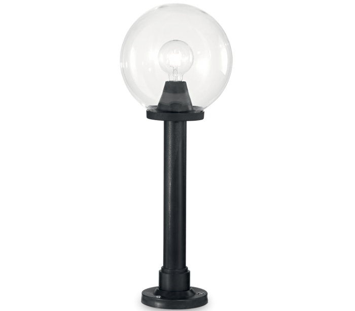 CLASSIC GLOBE udendørs bedlampe i et moderne design fremstillet i sortlakeret resin og klart plast. Lampen måler 82 cm i højden og anvender 1 x E27 lyskilde (Ekskl.). Der medfølger monteringssæt til lampen, til montering på faste underflader.