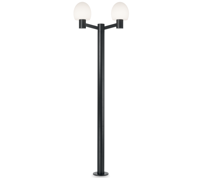 CONCERTO dobbelt udendørs bedlampe i et moderne design fremstillet i sortlakeret aluminium og hvid plast. Lampen måler 220,5 cm i højden og anvender 2 x E27 lyskilder (Ekskl.). Der medfølger monteringssæt til lampen, til montering på faste underflader.