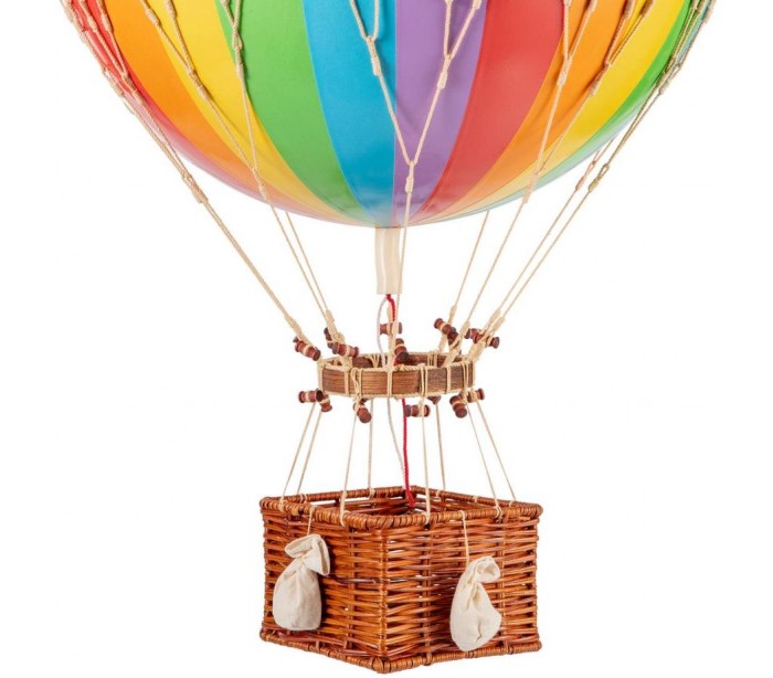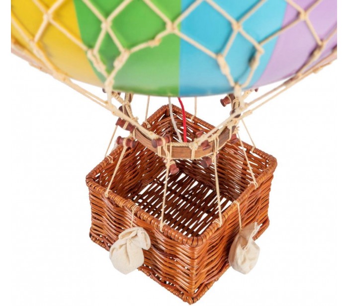 Jules Verne luftballon fra Authentic Models. Luftballon er udført i rattan og regnbuefarvet polypropylene og måler 70 cm i højden og 42 cm i diameter. Ballonen er ment til ophæng i loft.
