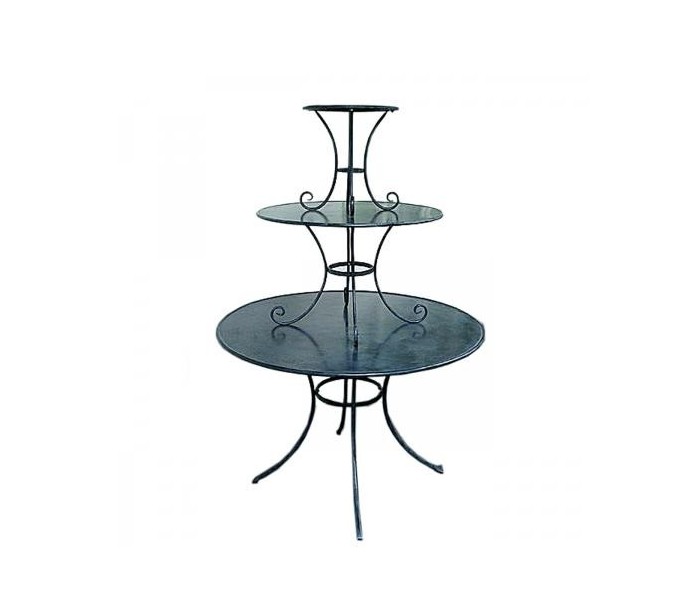 Dekorativt opsatsbord i 3 led, hvor det største har en diameter på 118 cm. Bordets samlede højde udgør 171 cm, og samles som ét bord. Bordet er i en antik sort lakering med et grønt stænk.