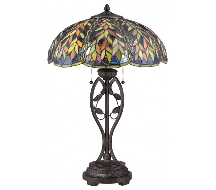 Belle bordlampe i et sandt Tiffany design fra amerikanske Quoizel. Lampen måler 64,8 cm i højden og leveres til europæisk standard til 2 x E27 lyskilder. Foden er udført i mørk bronzelakeret stål og med skærm i glas.