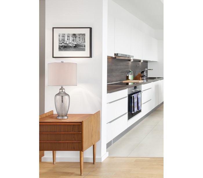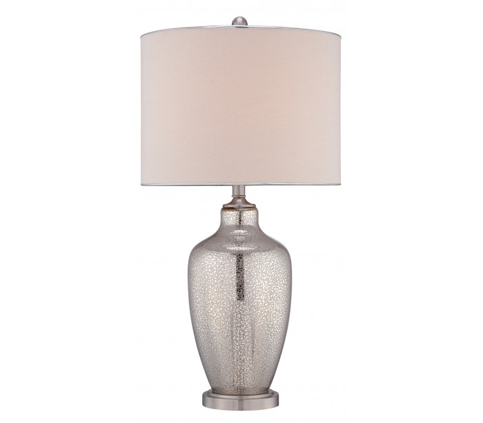 Nicolls bordlampe i et amerikansk design fra Quoizel. Lampen måler 75 cm i højden og leveres til europæisk standard til 1 x E27 lyskilde. Foden er udført i sølvfarvet mercury glas og med skærm i beigefarvet tekstil.